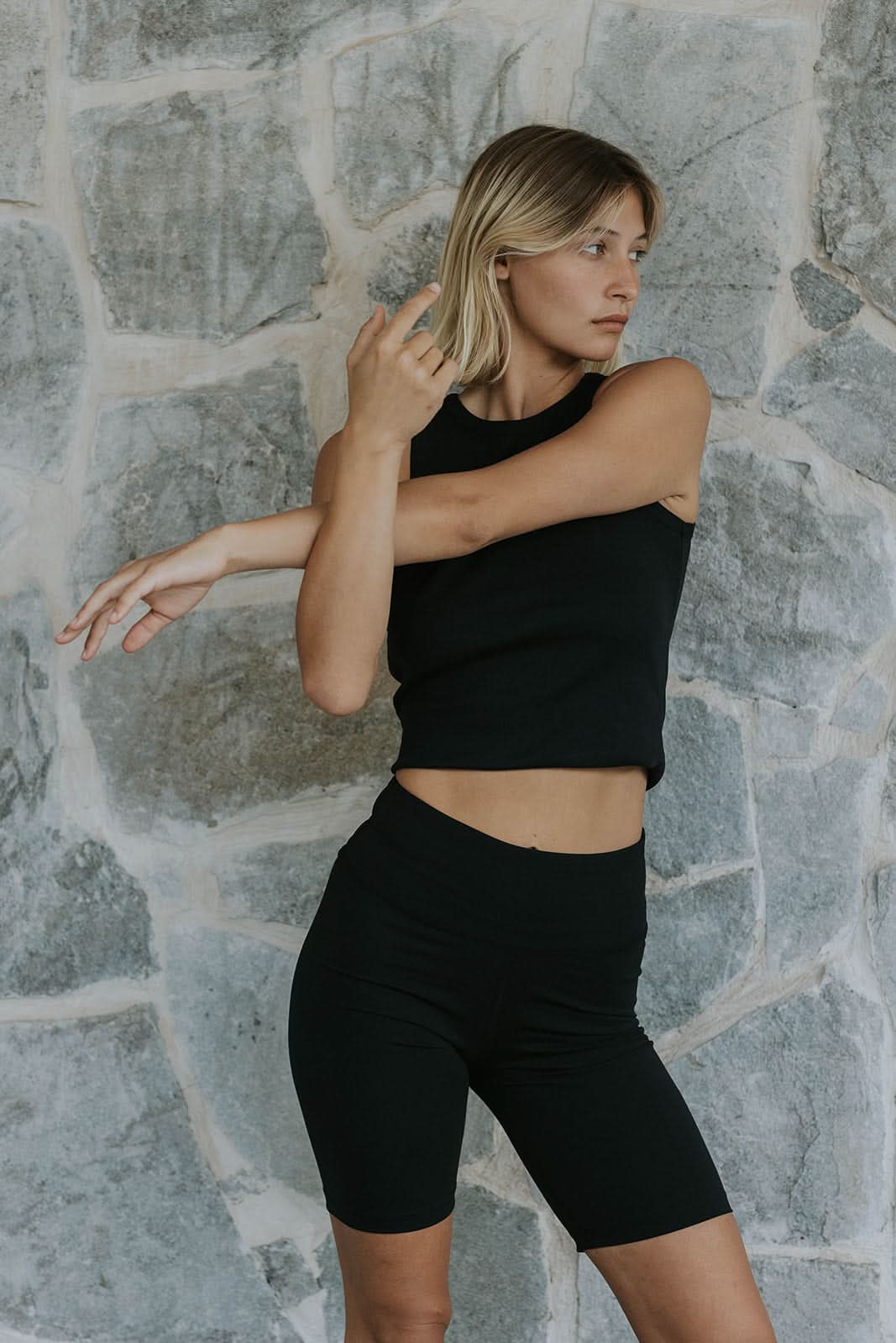 The fabric is extremely soft, pleasant to the touch and breathable. The organic cotton gently hugs the body, and the elastane provides flexibility that allows for free movement. The fit is flattering, and the feel is pleasant all day long.